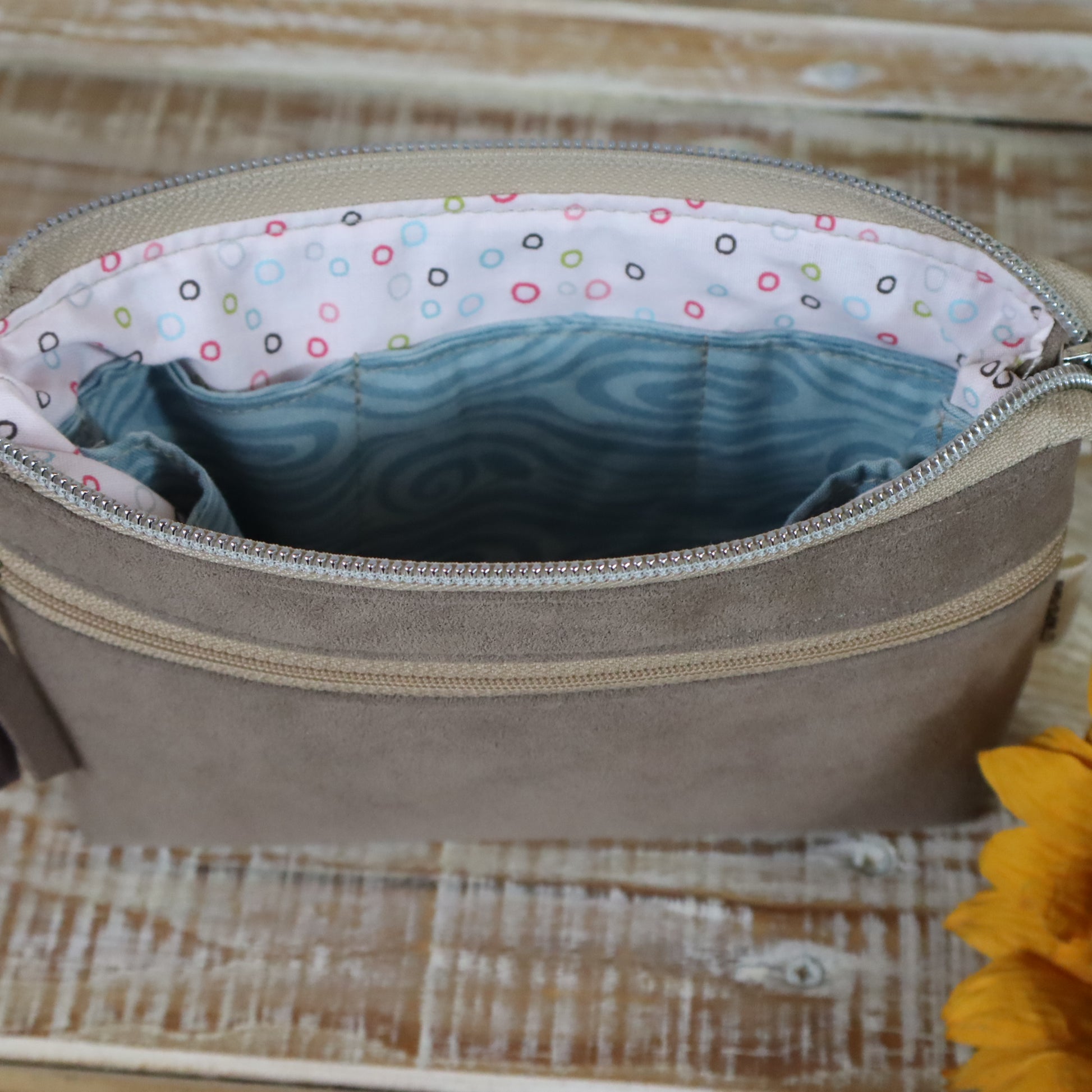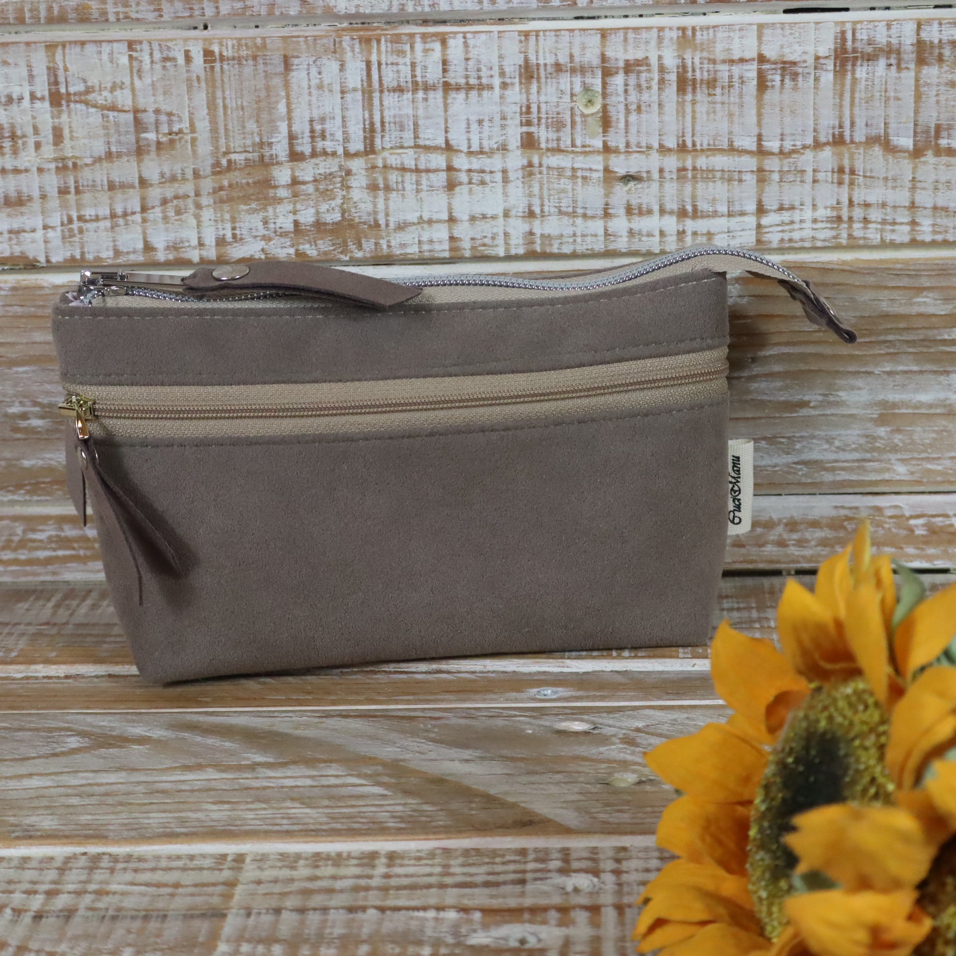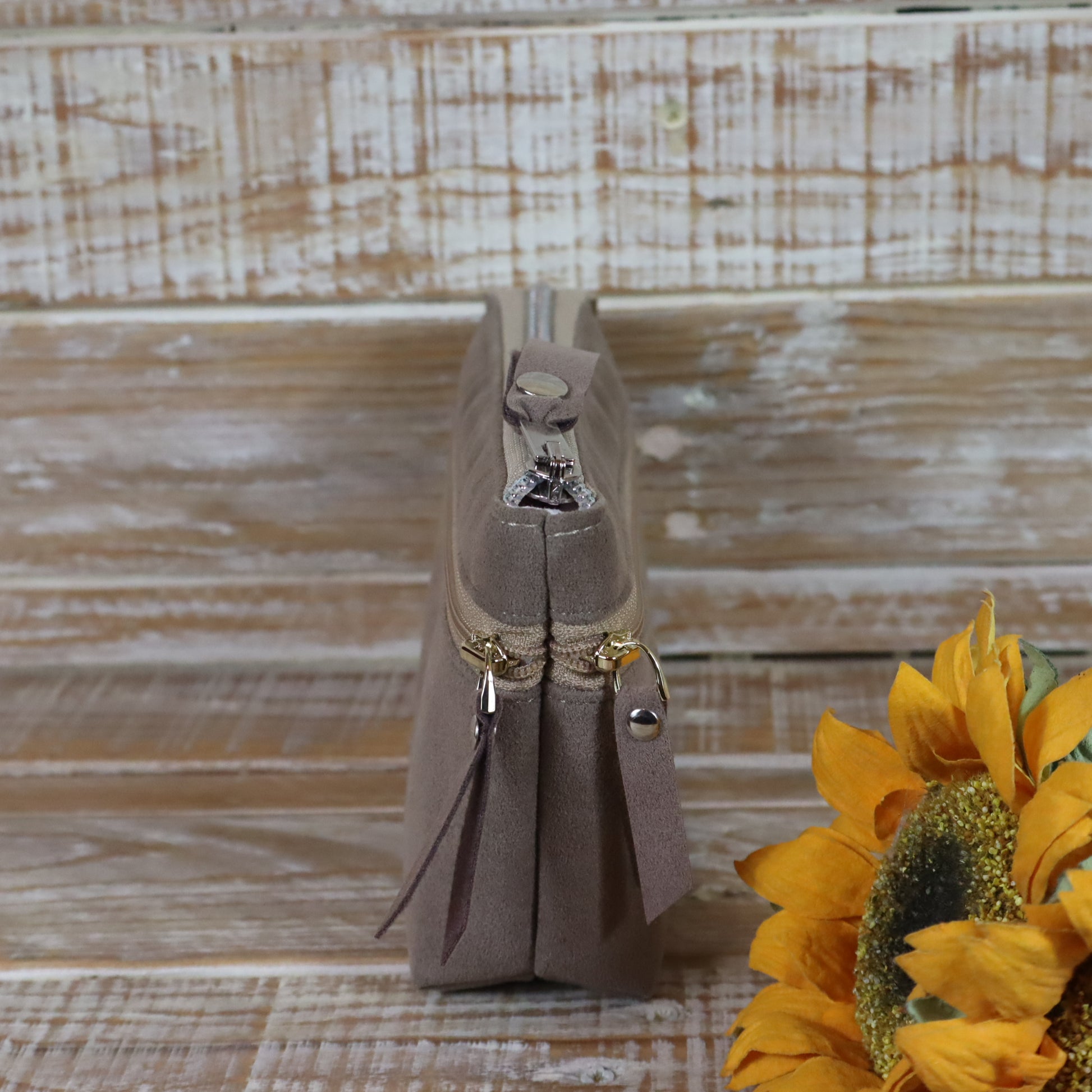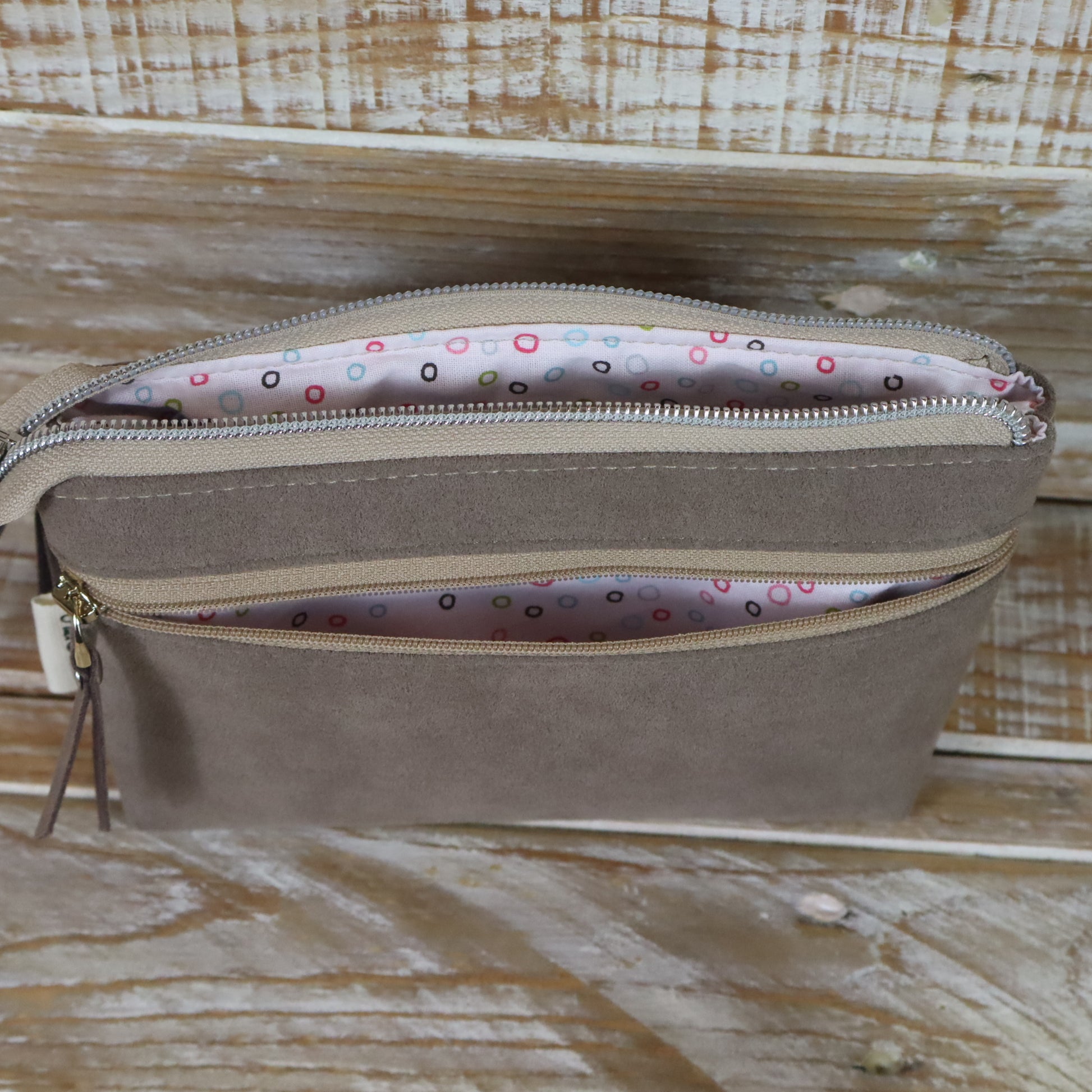 Sono un portafoglio pochette elegante e funzionale, realizzato esternamente in alcantara e in cotone americano resistente e super colorato all'interno.