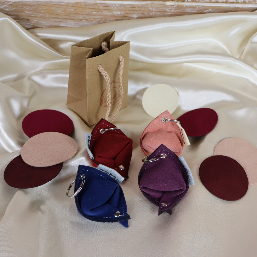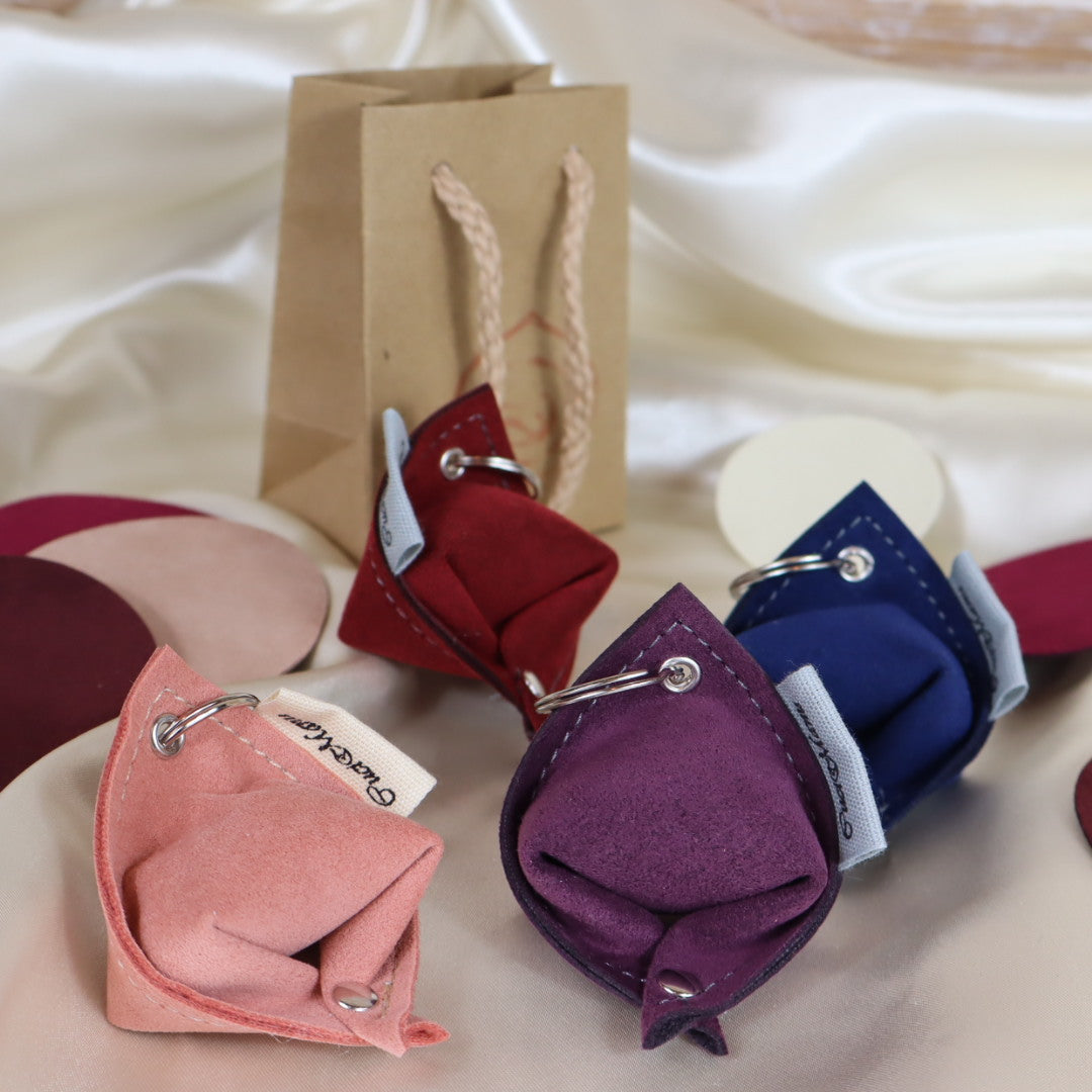 Sono un accessorio sostenibile realizzato attraverso il recupero di alcantara.